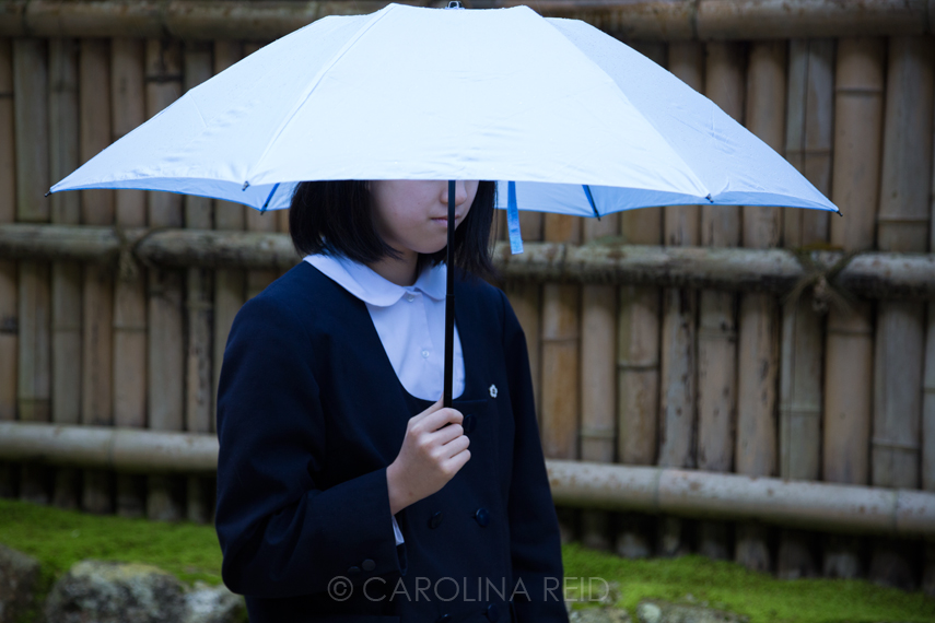 A schoolgirl shelters from the rain in the queue to enter Ginkakuji, also known as the Silver Pavilion. Uniformed school children are a common sight at temples all over Japan.
