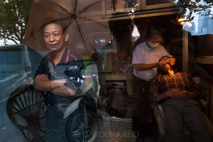 A dentist works on a patient’s tooth in full view behind a ground floor window in a commercial area in the Huangpu district.