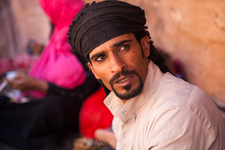 A local Bedouin, wearing a Keffiyeh, a traditional cotton Arab headdress and eye liner, made by extracting resin from trees and then burning it to produce kohl.