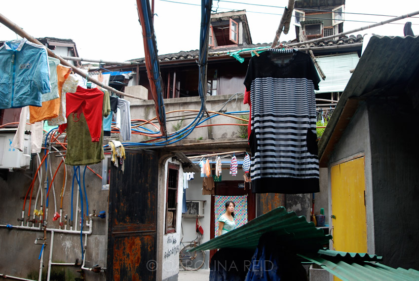 Many families in the Huangpu district live in small rooms surrounding a shared courtyard where communal activities take place. There are 24 families living around this courtyard with 12 upstairs and 12 downstairs.