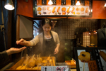 A woman sells kushikatsu in the Nishiki Market. These can be made with chicken, pork, seafood or seasonal vegetables and are skewered on bamboo, dipped in egg, flour, and panko and deep-fried in vegetable oil.