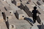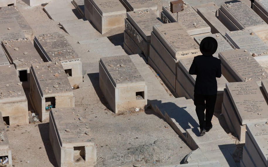 An Orthodox Jew in the Cemetery of the Mount of Olives. The Mount is central to Jewish tradition since it has been used as a Jewish cemetery for over 3,000 years and holds approximately 150,000 graves.