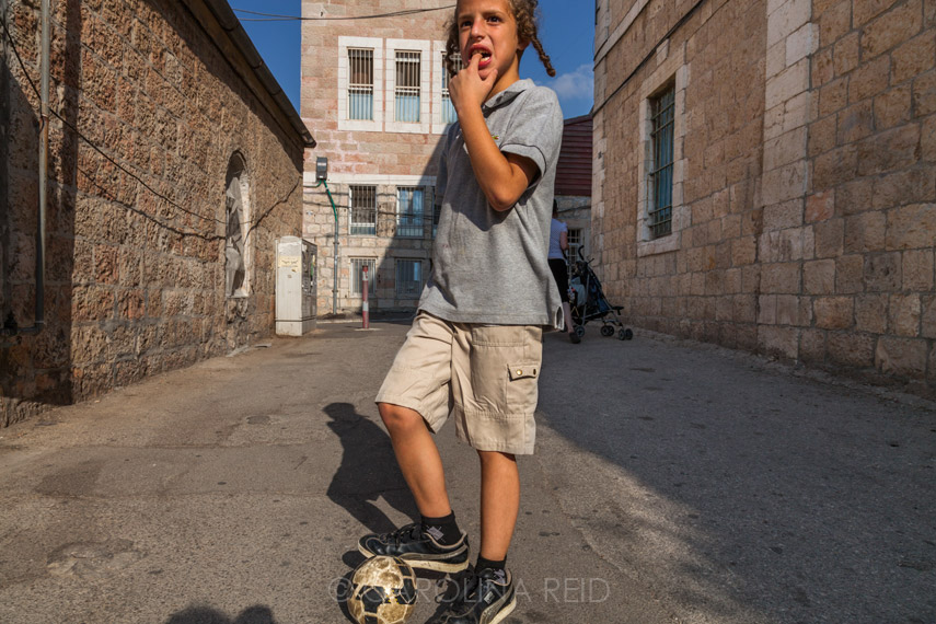 A boy playing football in Mea Shearim, one of the oldest Jewish neighborhoods in Jerusalem, populated mainly by Haredi Jews.