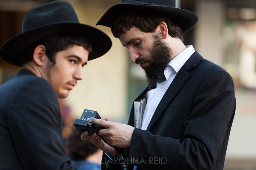 Hasidic Jewish men offering to put tefillin on male passers-by. These are a set of small black leather boxes containing scrolls of parchment inscribed with verses from the Torah, which are worn by observant Jews during weekday morning prayers.