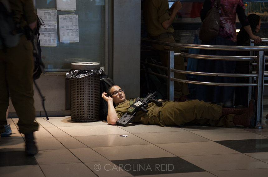 A soldier resting at the HaTachana bus station, the main bus station of Tel Aviv. Conscription exists in Israel for all citizens over the age of 18 with men being required to serve three years and women two.