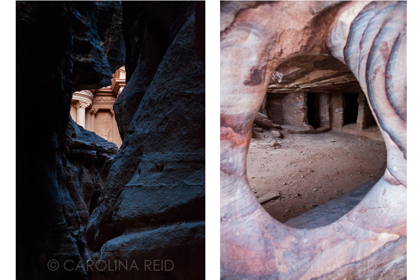This diptych features on the left Al Khazneh, popularly known as the Treasury, as viewed through a narrow crack of the Siq and on the right a cave carved out of the multi-coloured sandstone commonly found in Petra.